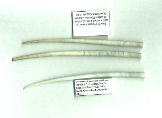 Dentalium (Antalis) spec, 90 m, Surfers Paradise, S of Brisbane, Australia , 141 x 5,7 mm and 132 x 5, 7mm, greenish (near to D. hedleyei), top Dentalium (Antalis) hedleyi, 210 m, N-Queensland, 140 x 6,1 mm, greenish (scan, better pictures in prep.)