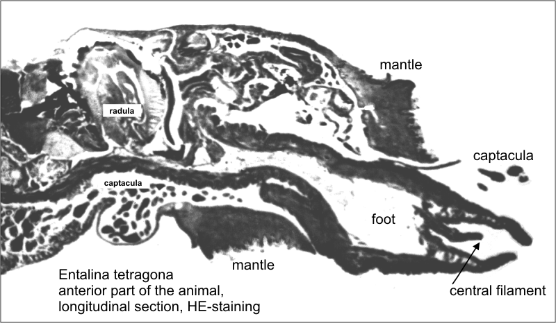 Literature: Chistikov SD (1982a). Modern molluscs of the family Entalinidae (Scaphopoda, Gadilida). 2. Subfamiliy Heteroschismoidinae -2. Zool Zhur, 61(9): 1309-1321. Chistikov SD (1982b). The modern Entalinidae (Scaphopoda, Gadilida). 1. Subfamily Heteroschismoidinae -1. Zool Zhur, 61(5): 671-682. Chistikov SD (1982c). The modern Entalinidae (Scaphopoda, Gadilida). 3. Subfamily Entalininae. Zool Zhur, 61(10): 1492-1500. Davis JD (1968). A note on the behavior of the Scaphopod, Cadulus quadridentatus (Dall) 1881. Proc. Malac Soc Lond, 38: 135-138. Knudsen J (1964). Scaphopoda and gastropoda from depths exceeding 6 000 meters. Galathea Rep, 7: 125-136. Mifsud C (1996). Living Mollusca from circalittoral coastal muds, off Western Malta. La Conchiglia, 28: 23-41. Odhner NH (1931.) Die Scaphopoden. Further Zool Res Swed Antarct Exped 1901-03. 2(5): 1-10. Pilsbry HA, Sharp B (1897-98). Scaphopoda. In: Tryon´s Manual of Conchology, Ser.1, 17:1-280. Poon PA (1987). The diet and feeding behavior of Cadulus tolmiei Dall, 1987 (Scaphopoda: Siphonodentalioida). Nautilus, 101(2): 88-92. Reynolds PD, Okusu A (1999). Phylogenetic relationships among families of the Scaphopoda (Mollusca). Zool J Linn Soc, 126: 131-154. Sahlmann B (1973). Untersuchungen zur Histologie und Nahrungsbiologie der Scaphopoden. Thesis, Univ Kiel, 107 pp. Sars M (1861). Om Siphonodentalium vitreum, en ny slaegt og art af dentalidernes familie. Christiania Universitets-Program for 1861. 29 pp. Sars M (1865). Malacozoologiske Jagttagelser. II. Nye Arter of Slaegten Siphonodentalium. Forh Videnskab Selsk Christiania (Aar 1864), p.296-315. Shimek RL (1987). Shell morphometrics amd systematics: a revision of the slender, shallow-water Cadulus of the Neorteastern Pacific (Scaphopoda: Gadilidae). The Veliger, 32(3): 233-246. Shimek RL (1990). Diet and habitat utilization in a Northeastern Pacific Ocean scaphopod assemblage. Amer Malacol Bull, 7: 147-169. Simroth H (1864). Bemerkungen über die Morphologie der Scaphopoden. Z Naturw. 67: 239-259. Steiner G (1990). Beiträge zur vergleichenden Anatomie und Systematik der Scaphopoda (Mollusca). Thesis, Univ Wien, 176 pp. Steiner G (1992). Phylogeny and classification of Scaphopoda. J Molluscan Stud, 58: 385-400. Steiner G (1998). Phylogeny of Scaphopoda (Mollusca) in the light of new anatomical data on the Gadilinidae and some Problematica, and a reply to Reynolds. Zool Scripta, 27(1): 73-82. Stimpson W (1865). On certain genera and families of zoophagus gasteropods. Amer J Conch. 1: 55-64.